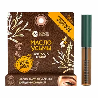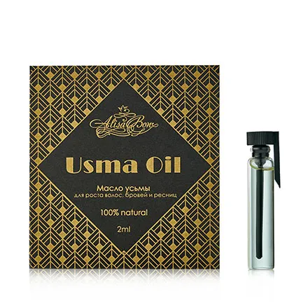 Усьма для бровей в концентрированном виде полезна тем, чьи брови пострадали в ходе эстетической коррекции. Препарат находится в стильном черном флаконе из непрозрачного пластика. В крышку встроена пипетка для дозирования. Имеет маслянистую структуру зеленого цвета, характерного для усьмы. Производитель утверждает, что препарат содержит помимо усьмы более двух десятков компонентов, которые сделают брови более густыми.