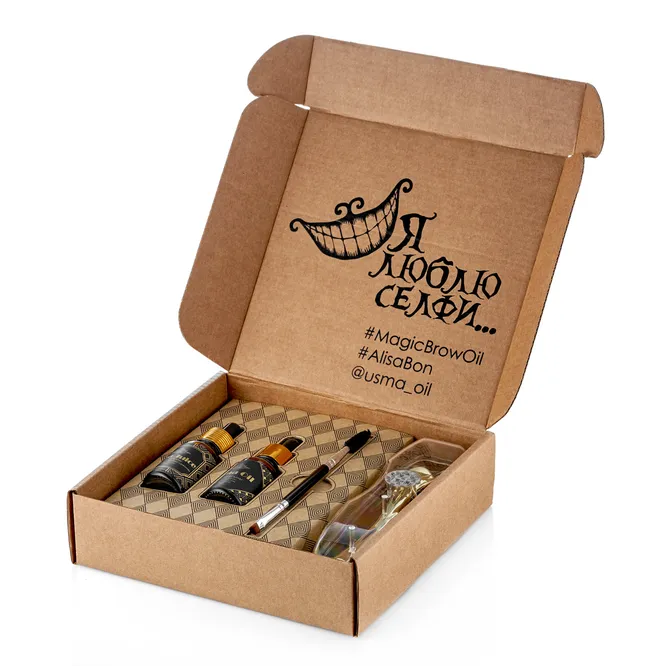Бренд AlisaBon разработал целый набор для восстановления, укрепления и роста бровей и ресниц. В его состав входят не только масло усьмы для ресниц и бровей, но и сок из листьев растения. Оба препарата подпитывают фолликулы волос полезными веществами, необходимыми для их роста и питания кожи. В комплекте есть мезороллер — специальное устройство для массажа кожи в зоне нанесения препаратов. Он помогает улучшить кровообращение и усилить эффект от нанесения сока и масла. Также в набор производитель положил мягкую щетку для бережного нанесения препаратов.