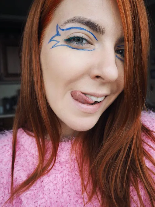 Пока Катя постигала правила маскировки среди визажистов МАС, я залипла на страничке его более бюджетного аналога. Я решила повторить макияж из аккаунта 3ina — там их тоже такая гора, что с трудом выбрала несколько. Начать решила с «рыбок» вокруг глаз. Я уже давно смирилась, что ровных стрелок не существует, как получается, так и рисую, а тут такая возможность разгуляться! Несмотря на мою «нежную дружбу» с синей подводкой Kiko, нарисовать вышло не с первого раза: на висках я постоянно «косила», из-за чего линии выходили ну очень уж толстые, приходилось стирать и дорисовывать заново. Тушь тоже Kiko, зеленого оттенка. Весело, задорно, но с таким мейком сразу начинаешь хотеть на какой-нибудь рейв или корпоратив, очень уж напоминает маску (это вам говорит человек, нарисовавший себе на корпоратив подводкой маску Харли Квин на половину лица).