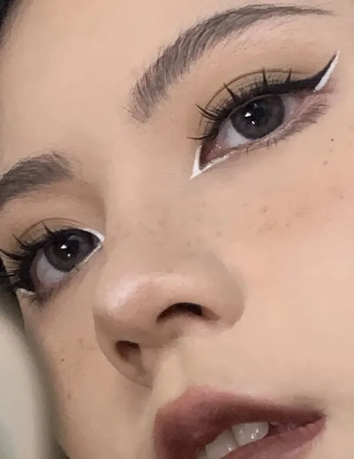 Верхние ресницы разделены на отдельные пучки с явной разницей в длине — самые длинные располагаются ближе к внешнему углу глаза, создавая направление, раскрывающее взгляд. Белая стрелка не только осветляет глаза, но и делает их главным украшением всего макияжа.