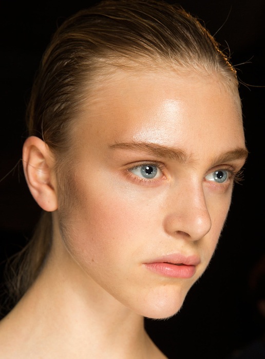 Основой подиумного макияжа на показе Alexander Wang весна-лето 2015 стала сияющая кожа. Сперва сделав ее тон ровным, визажисты схватились за продукты, которые способны сделать кожу блестящей. Бронзирующей пудрой они подчеркнули скулы, область чуть выше и участки над висками — хайлайтером теплого оттенка. На веках моделей оказались тени в тон бронзеру (впрочем, если под рукой только он, можно подчеркнуть глаза и с его помощью), на губах едва виднеется бальзам. Уже второй сезон подряд мастера, творящие в закулисье у Вэнга, настаивают на том, что брови нужно высветлять, а не выделять темными карандашами и гелями. Мы пока не уверены, что многие возьмутся повторить этот прием на себе, но можем сказать, что эффект макияжа без макияжа он усиливает отменно.