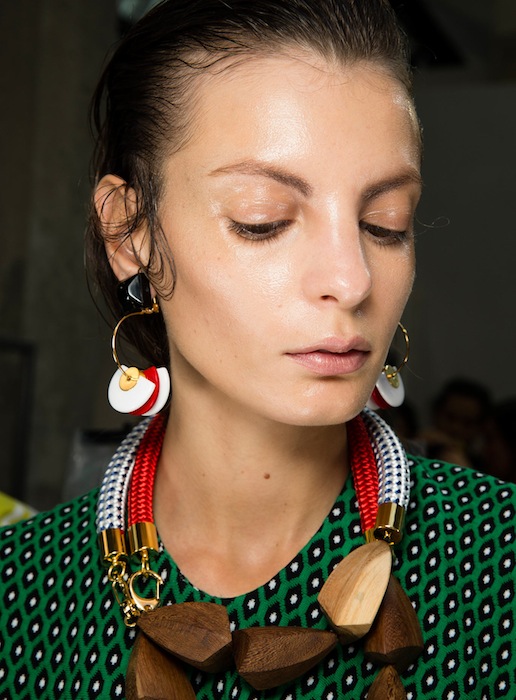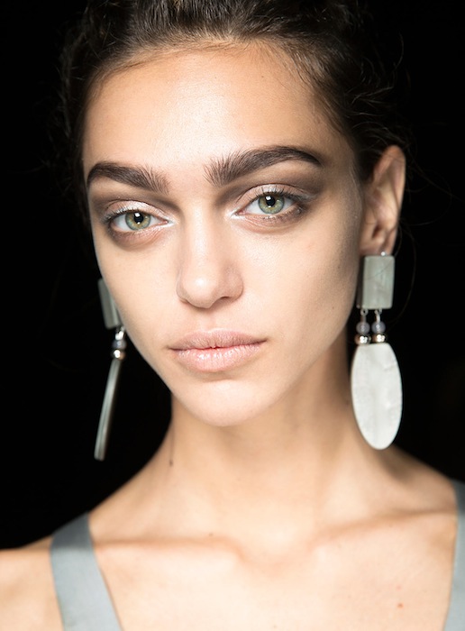Визажисты решили перенести мокрый эффект и в макияж для показа, поэтому от модных в последнее время тональных средств для создания матового покрытия им пришлось отказаться. Чтобы добавить коже влажного сияния, можно смешать не очень плотный тональный крем с увлажняющим. Усилить эффект можно с помощью нанесения прозрачного бальзама на губы. Результат будет выглядеть наиболее естественно, если глаза не красить вовсе.