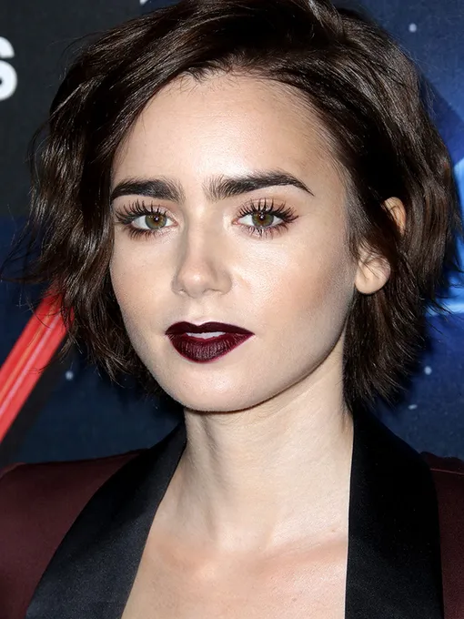 Еще один беспроигрышный вид макияжа — без акцента на глаза вообще. Нужно только выделить ресницы черной тушью и на этом закончить. Все основное внимание коже: идеально ровная, светлая, матовая, будто фарфоровая кожа великолепно смотрится в сочетании с темными помадами. Бордовая, коричневая, винная и даже фиолетовая — выбирай любую! От румян мы снова отказываемся, но можно сделать легкий контуринг, подчеркнув скулы.