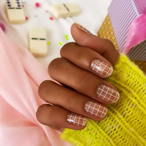 Четкий геометрический принт на прозрачной базе дает чистый и свежий эффект. Такой маникюр отлично сочетается с повседневными образами, но легко впишется и в романтический вечер. Главное, что он всегда выглядит аккуратно.