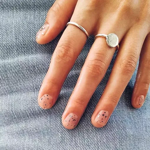 Нюдовая база с черными вкраплениями смотрится непринужденно и чуть игриво. Идеальный вариант для дней, когда хочется легкости и простоты, но с изюминкой. Такой маникюр будто поднимает настроение сам по себе.