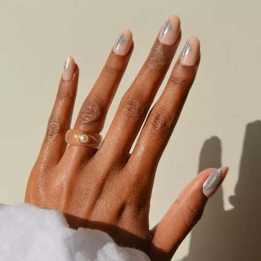 Прозрачная нюдовая база и голографические звезды создают эффект «вау» без перегруза. Это маникюр, который идеально выглядит как при дневном свете, так и в мягком вечернем освещении. Подходит, если хочется быть нежной, но с намеком на магию.