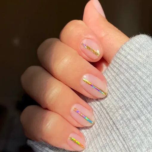 Тонкая полоска из золотого и голографического блеска визуально удлиняет ногти. Такой маникюр можно назвать универсальным украшением — он подойдет и для офиса, и для свидания. Легкий способ добавить сияния в образ, причем такой дизайн подойдет буквально каждой ручке.
