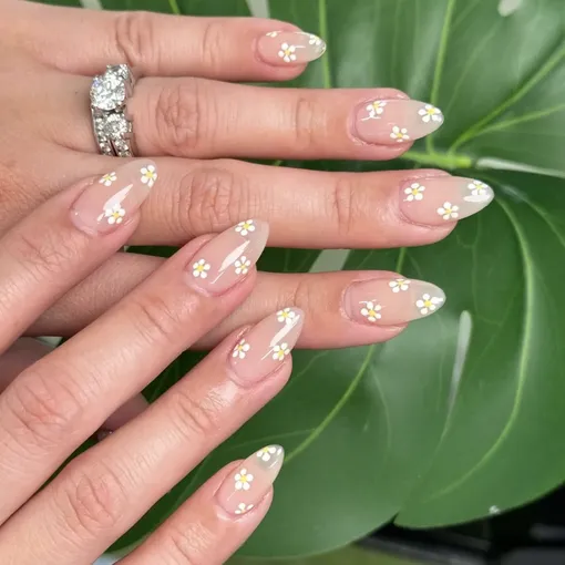Белые ромашки на полупрозрачной базе — это чистая нежность. Такой маникюр всегда ассоциируется с легкими летними платьями, солнцем и хорошим настроением. Отлично подходит для свиданий на свежем воздухе.