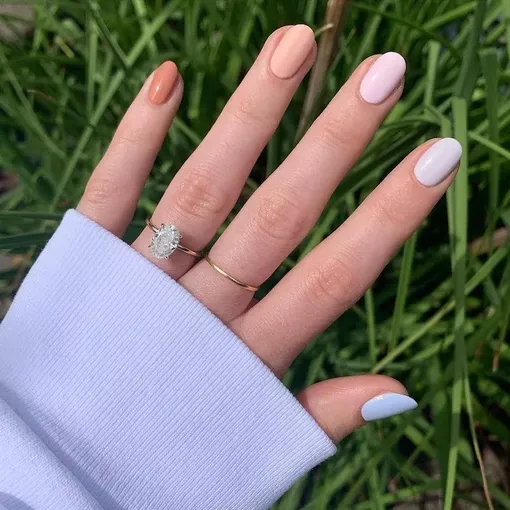 Разные пастельные оттенки на каждом ногте создают мягкое, но заметное настроение. «Я расслаблена, но у меня есть вкус», — говорит этот маникюр за свою хозяйку. Этот дизайн особенно хорош для теплых свиданий или прогулок.
