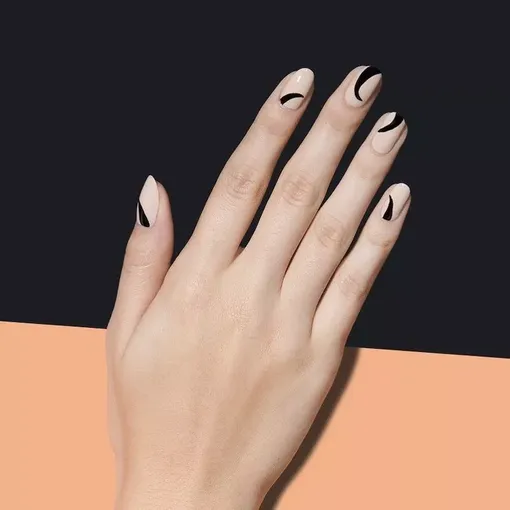 Черные абстрактные линии на бежевой базе — это про минимализм с характером. Маникюр, который добавляет образу чуть дерзости, не перегружая его. Особенно эффектно смотрится в вечерних луках.