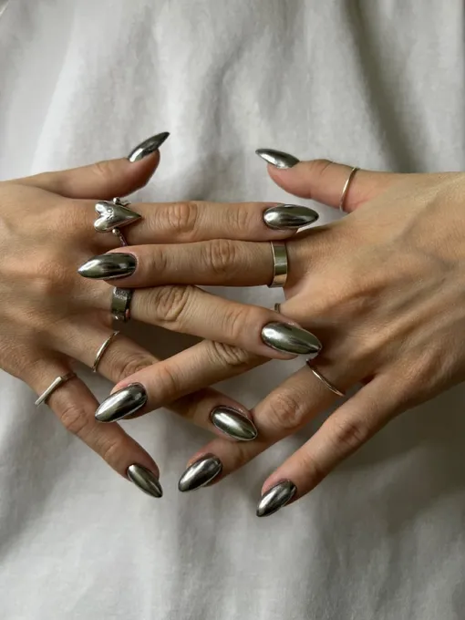 Сияющие покрытия отлично раскрываются зимой, а хром можно считать самым эффектным из них. Откажись от декора и позволь зеркальному финишу сделать всю работу за тебя. Но есть одно правило: аккуратные, ухоженные кутикулы тут обязательны.
