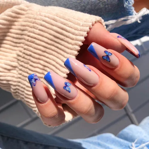 Эта идея маникюра будто вдохновлена волшебными сине-голубыми крыльями бабочки из рода Морфо, которая считается исполнительницей желаний. Загадала что-то сокровенное на этот год? Тогда непременно опробуй этот дизайн по весне, и загаданное точно сбудется.
