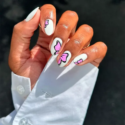 Чисто белый лак не всегда комплиментарно смотрится на ногтях, но является отличным вариантом фона для ярких нейл-рисунков. В этом случае главным акцентом стали лиловые крылья бабочки, которые буквально оживают с каждым движением пальцев.