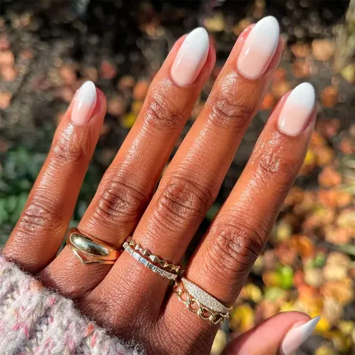 Плавный градиент, перетекающий от нежно-розового к белому, смотрится очень ненавязчиво и аккуратно, но при этом ультрастильно. Создается ощущение, что кончики ногтей будто окунули в миску с густым кремом для торта.