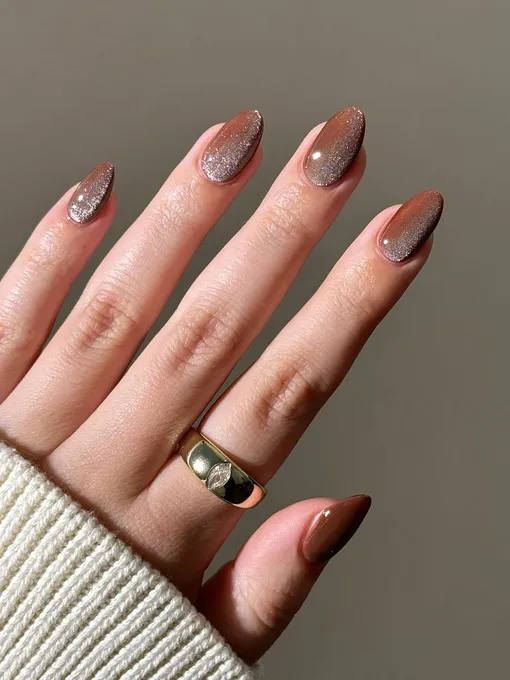 Даже самый светлый глиттер будет смотреться круто на шоколаде. Главное тут правильно все нанести! Советую выбрать «кошачий глаз», чтобы блеск был деликатным и необычным.
