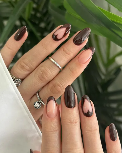 Шоколадный цвет сочетается с прозрачными участками и мягкими формами, а сердечки оставляют легкий намек на романтику без приторной милоты. Отличный вариант маникюра на февральские праздники ;)