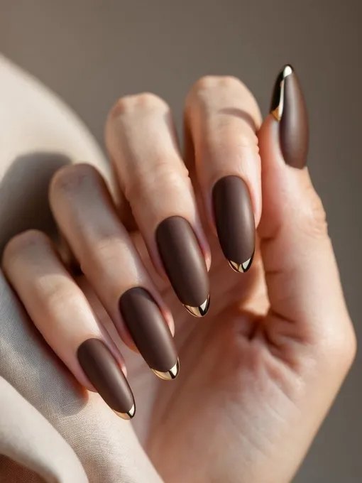 Матовый финиш сразу превращает классический маникюр в нечто графичное и дерзкое. Добавление золотого металла на кончики делает дизайн чуть более вечерним. Это пример того, как один небольшой акцент может полностью изменить настроение маникюра.