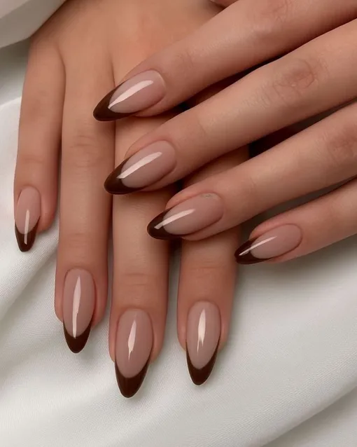 Если ты не уверена в том, что шоколад тебе подойдет в качестве основного цвета, то попробуй его в качестве френча. Особенно хорошо такой дизайн работает на миндалевидной форме, где линия френча визуально вытягивает ноготь.