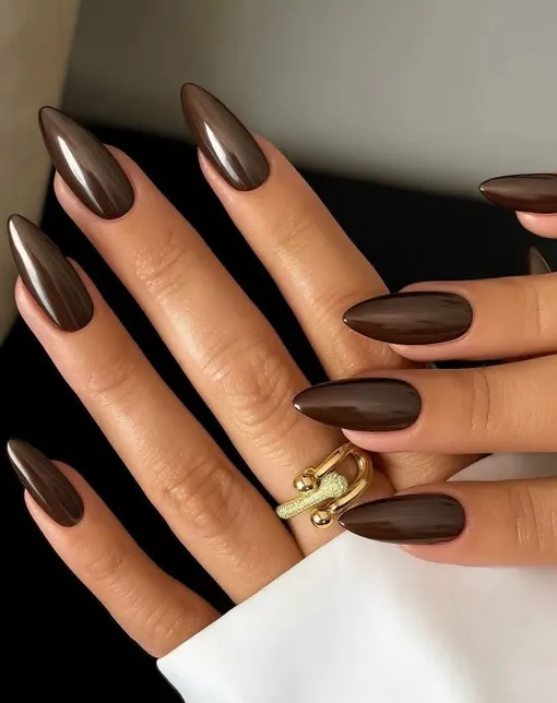 Чистый шоколад без декора — самый простой способ опробовать его на себе. Здесь все держится на оттенке: теплый, плотный, с легким красноватым подтоном, который красиво подчеркивает кожу рук. Такой маникюр выглядит дорого именно за счет простоты и красивой формы самих ногтей.