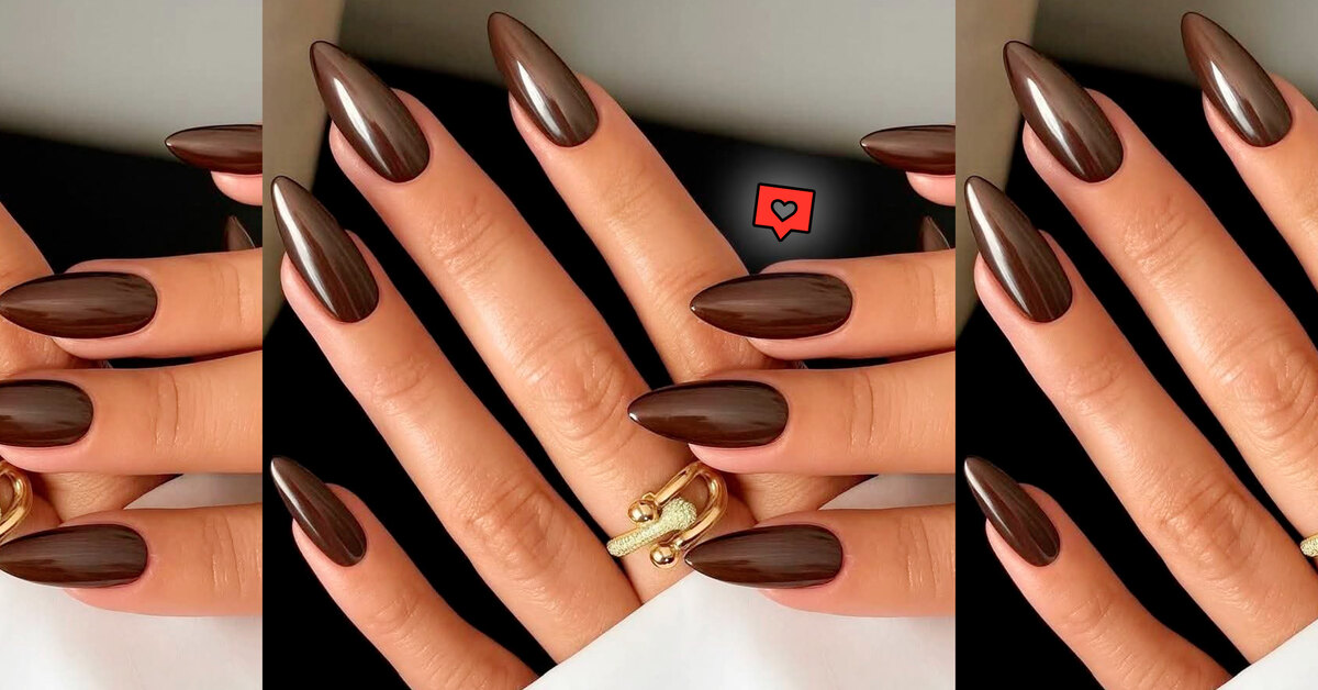 Чистый шоколад без декора — самый простой способ опробовать его на себе. Здесь все держится на оттенке: теплый, плотный, с легким красноватым подтоном, который красиво подчеркивает кожу рук. Такой маникюр выглядит дорого именно за счет простоты и красивой формы самих ногтей.