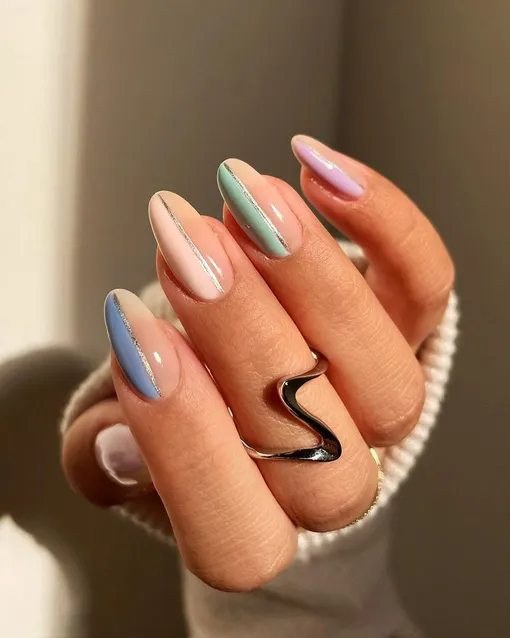 Если ты хочешь добавить немного цвета, но при этом не выглядеть слишком экстравагантно, то эти серебристые полосы в сочетании с пастельными оттенками лака — как раз то, что тебе нужно. Смотреться будет нежно и невероятно женственно!
