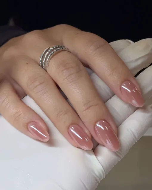 Для любителей супернюда есть и такой вариант. Тут тренд на розовые ногти приобретает желейный вайб, из-за чего маникюр выглядит особенно нежным и сладким.