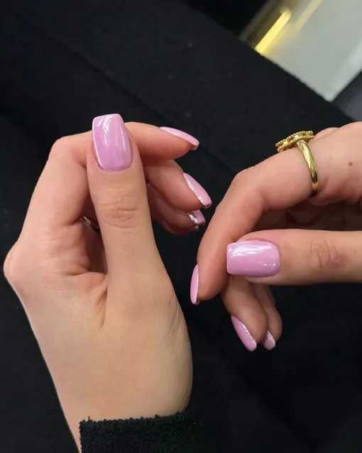 Начну с немного нестандартного, но все еще красивого маникюра. Здесь розовый цвет приобрел сиреневый оттенок, который выгодно смотрится на ногтях квадратной формы.