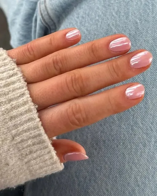Нюдовый розовый оттенок выглядит чисто и элегантно с хромированным топом, который создает почти зеркальный эффект. Отличный вариант для ногтей средней длины.