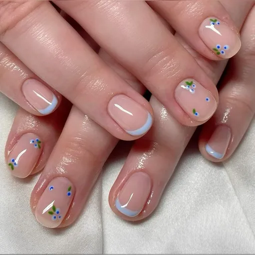 Здесь у нас не цветочки, но я без ума от этого дизайна! Голубой французский маникюр украшен изображением ягодок черники с темно-синими и зелеными акцентами. Такой дизайн будет актуален весь год.