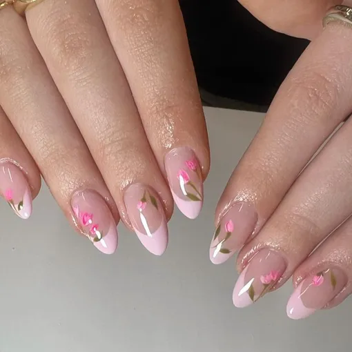 Отличный дизайн маникюра на любой праздник, будь то 8 марта, День всех влюбленных или День матери. Нежно-розовые кончики выгодно сочетаются с более яркими тюльпанами, символизируя собой нежность, женственность и чувственность.