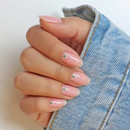 Я просто без ума от этого нежного маникюра. Спешу заверить, что с таким дизайном справится кто угодно — хоть новичок, хоть профи. Наносишь пару слоев своего любимого нюдово оттенка, берешь зубочистку и ставишь точки любым зеленым лаком ближе к нижнему краю ногтя, а прямо под ним — маленькую белую точку.
