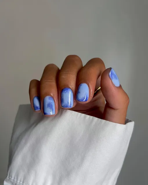 Чтобы создать на ногтях «вареный» эффект модных джинсов из 1980-х, попроси мастера сделать мраморный переход от темно-синего к голубому.