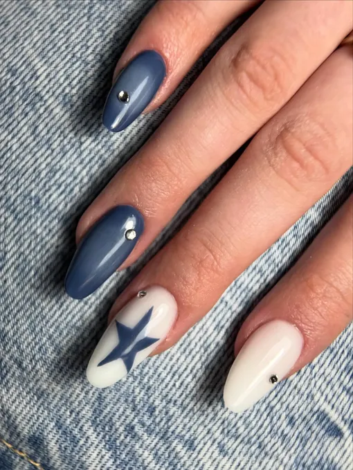 Джинсы носят настоящие рок-звезды! В глубине души чувствуешь себя одной из них? Тогда бери этот дизайн ногтей на заметку. Несколько страз и звезда в качестве акцента создадут образ в духе ретро.