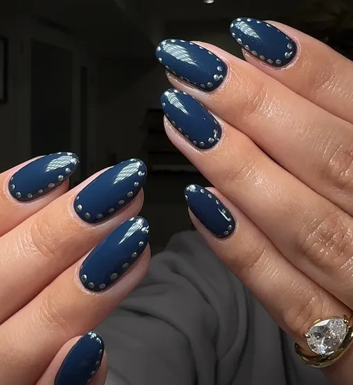 Шипы — самый простой способ добавить дерзости джинсовому образу, и маникюр — не исключение. Добавь серебристые точки по краям ногтей, и твой смелый маникюр в стиле деним готов!