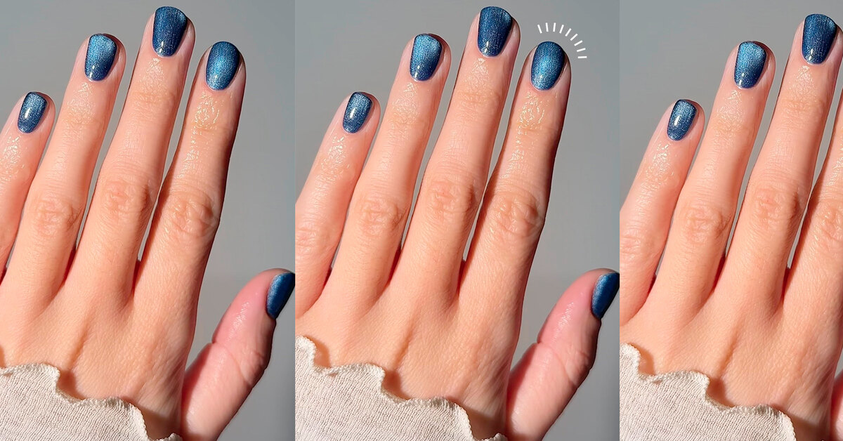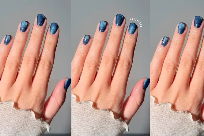Хорошая новость: чтобы передать текстуру любимых джинсов, не нужно быть профи в дизайне ногтей. Добиться визуального эффекта той самой плотной «ткани» поможет одна из самых доступных техник — «кошачий» глаз. С правильными оттенками синего даже самый простой домашний маникюр будет соответствовать уровню стиля любимых винтажных джинсов.