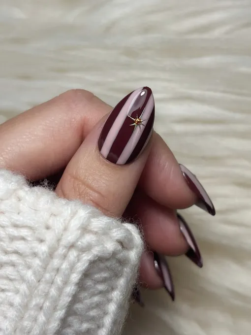 Обычно полоски ассоциируются у нас с летом и отпуском у моря, но правильная цветовая комбинация и пара хромированных акцентов мгновенно перенесут тебя с пляжного шезлонга в новогодний вечер. Нам нравится неожиданная сливово-розовая палитра, но ты можешь выбрать любую. Ну а если хочешь неумирающей классики, сочетай блестящий белый лак со своим любимым оттенком красного.