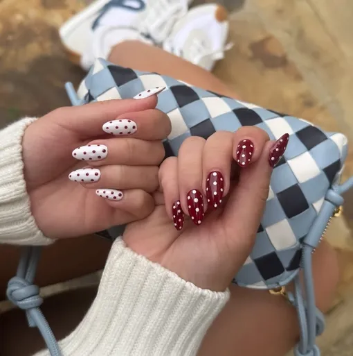 «Гороховый» принт переживает свой звездный час. Взгляни на праздничную версию знаменитого дизайна: на одной руке глубокий матовый красный фон украшен белыми точками, а на другой цвета зеркально меняются. Такая игривая ассиметрия выглядит весело и празднично, намекая на подарочную упаковку.