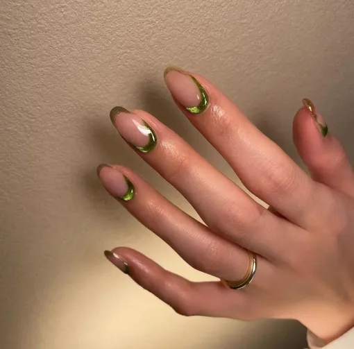 Здесь рамочный френч представлен в виде рамочки, повторяющего форму ногтя. Акцент тут на зеленом цвете, обработанного втиркой для эффекта «кошачий глаз». Подходит тем, кто устал от классики и хочет что-то более футуристичное, но не броское.