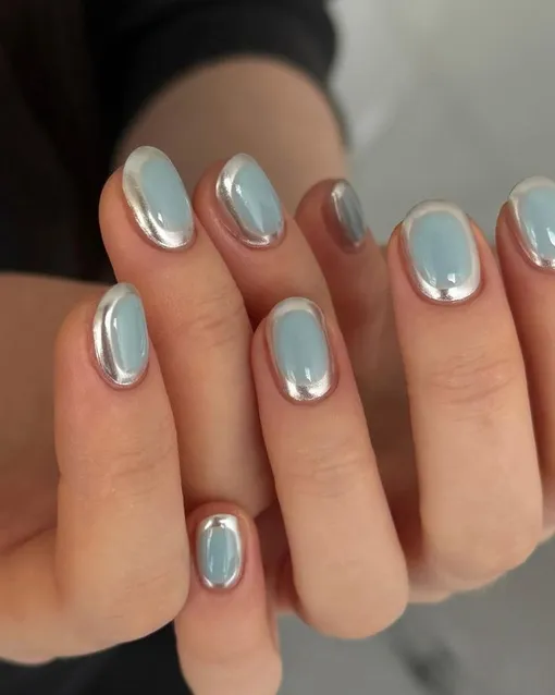 Хромовая рамка здесь повторяет форму ногтя, а внутренняя часть заполнена небесно-голубым. Она отлично сочетается с минималистичными украшениями из серебра.