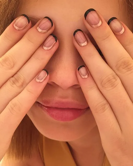Этот дизайн играет на цвете и текстуре. Верхний край ногтя выделен графичным черным, а основание обведено золотым. Визуально линия образует замкнутую петлю и создает эффект «двойного френча». Такой дизайн требует идеально ровной формы ногтей и хорошо смотрится на короткой длине.