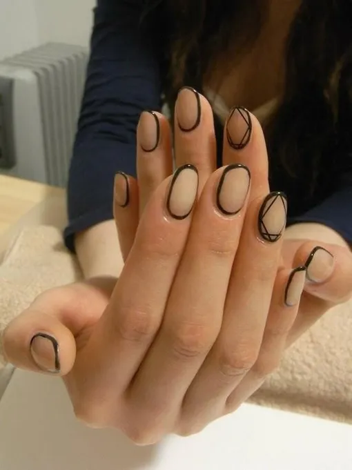 Этот дизайн — находка для любителей нейтральной базы и геометрии. Черная окантовка идет по всему периметру, но на нескольких ногтях появляются неожиданные формы — диагонали, ромбы, пересечения. Идеально для длинных ногтей овальной формы.