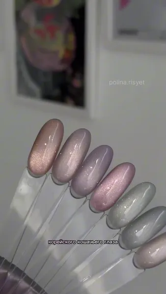 - Выбери несколько разных (в идеале — 4), но сочетающихся между собой оттенков лака с эффектом «кошачий глаз».