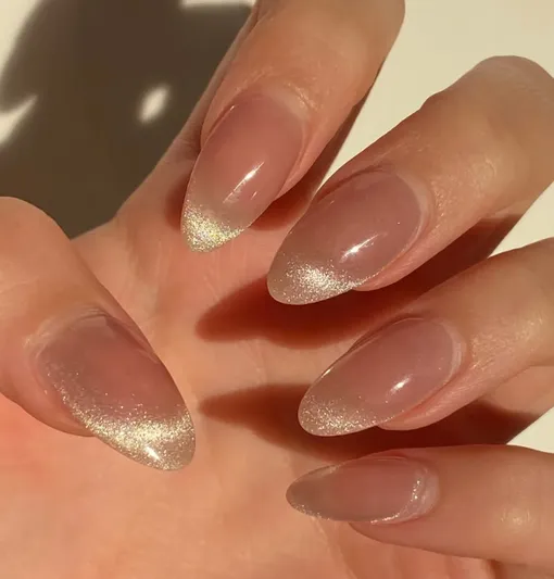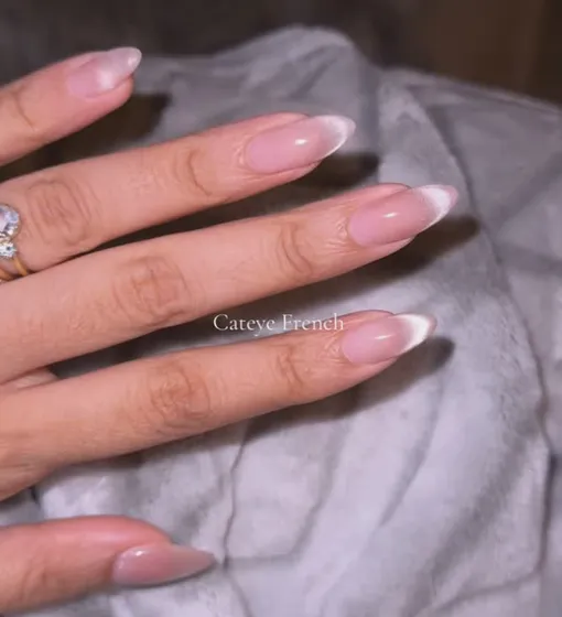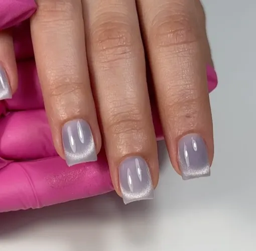 Маникюр с эффектом «кошачий глаз» давно не новость: магнит помогает выстроить металлические частицы в лаке так, чтобы получился бархатистый, переливающийся блик, словно зрачок кошки в темноте. В классической версии такой лак наносят поверх нейтральной базы. Фантомный френч устроен иначе.