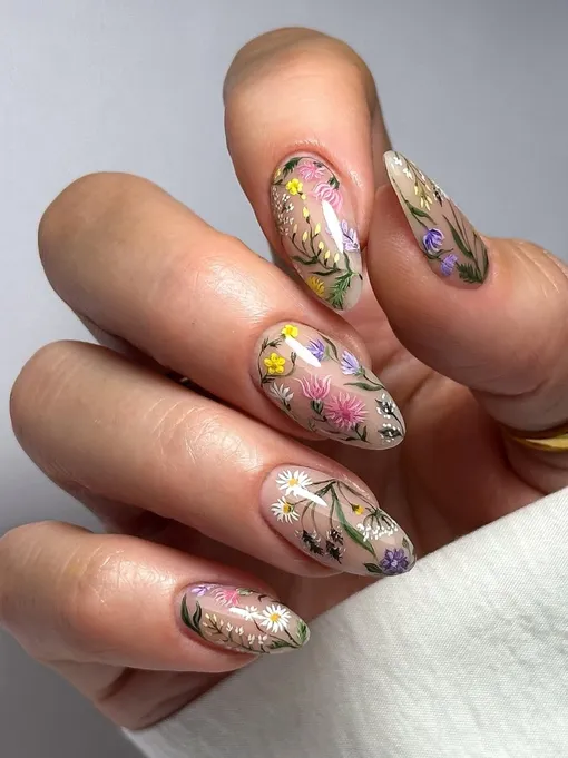 Устала от типичных маргариток и роз, которыми чаще всего дополняют цветочный маникюр? Тогда разнообразь свой дизайн необузданной красотой букета, будто собранного прямо в поле. Такое разноцветье будет очень эффектно смотреться на пальчиках и добавлять образу стильной простоты.