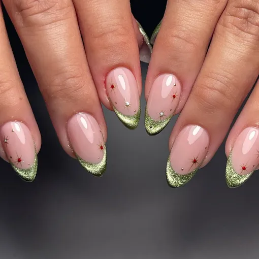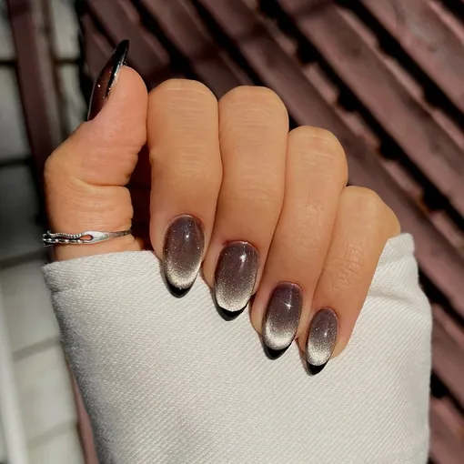 А что если перевернуть тренд с ног на голову? Возьми за основу лак с эффектом «кошачий» глаз и заверши маникюр глянцевыми кончиками в цвет базы.