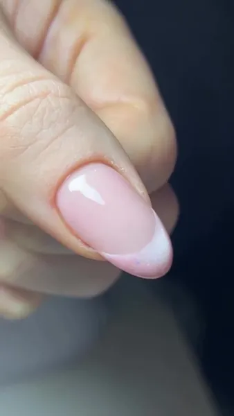 Тонкая и переливающаяся линия улыбки в богатом оттенке розового золота будет безупречно смотреться на коротком френче с максимально естественной основой под цвет натурального ногтя.