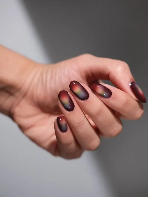 Аура-маникюр в цвете колы также будет смотреться очень оригинально. Добиться такого эффекта без аэрографа можно с помощью обычного спонжа для макияжа. Для этого достаточно нанести на него лак в темно-коричневом цвете по краям, а в середину добавить более светлый оттенок коричневого. Останется только отпечатать готовый рисунок со спонжа на ногтях и удалить излишки лака с кожи.