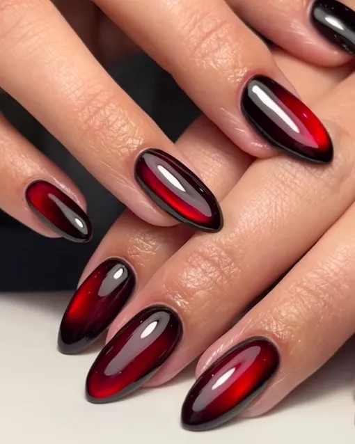 Этот магический маникюр с эффектом бархата переливается от кроваво-красного к черному в зависимости от переливов света, а ультраглянцевый топ превращает поверхность в хрустальное стекло. Неотразимый образ, особенно если «темное» Рождество — это твой вайб.