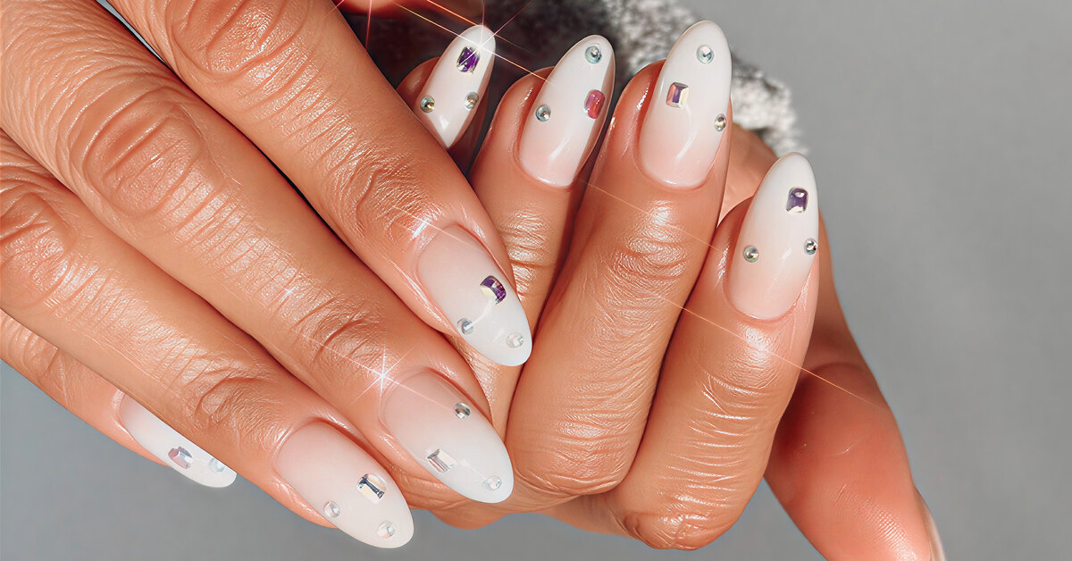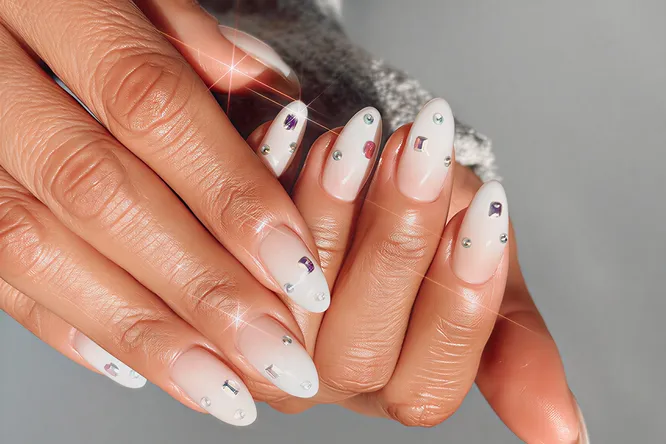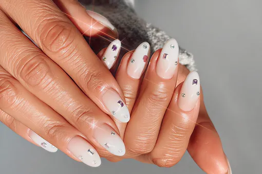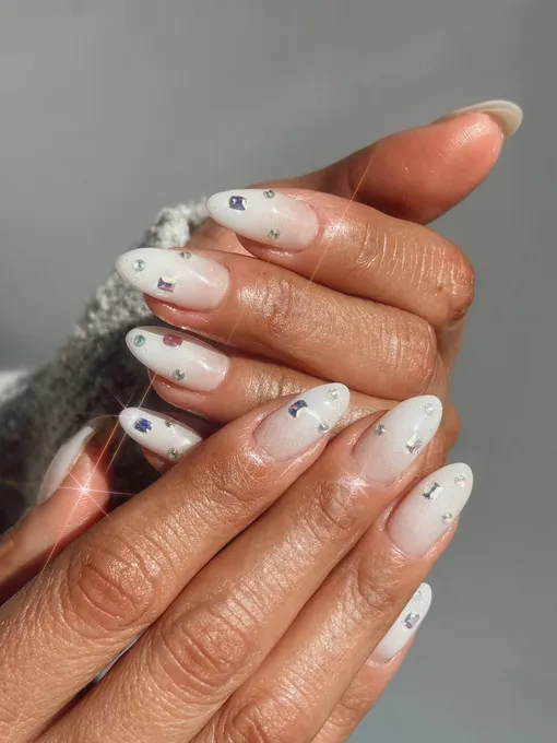 Ногтевой мастер Куини Нгуен растушевала мягкий белый хром в облачный омбре и добавила деликатные акценты из страз, которые ловят свет. Образ получается воздушным и сияющим. В подписи к фото Куини призналась, что вдохновлялась главным оттенком 2026 года, то есть «облачным танцором».