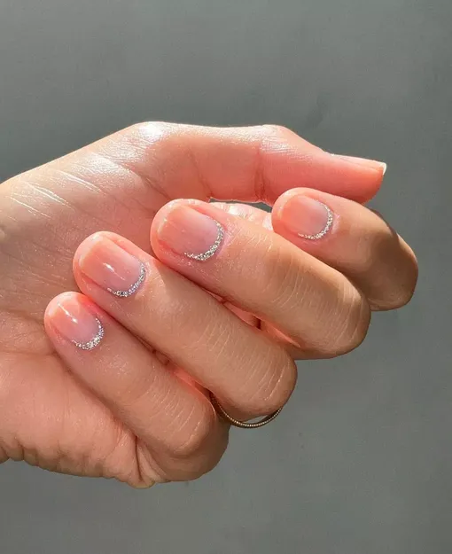 Такой деликатный «поясок» с эффектом легкого сияния — идеальный способ добавить немного блеска к маникюру с лечебным покрытием, сохраняя их аккуратный вид и не мешая процессу восстановления.